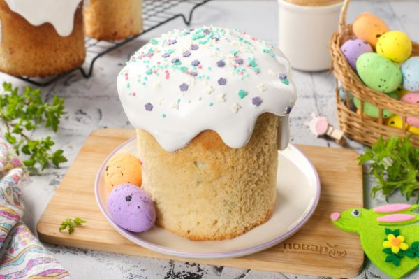 Глазурь густеет не сразу, поэтому можете не торопясь нанести её на все остывшие куличи. Украсьте по вкусу.
