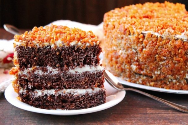 Обмажьте кремом бока и верх торта. Превратите в крошку оставшуюся курагу и орехи, украсьте ими верх и бока. Уберите в холодильник на 2-3 часа, для пропитки.