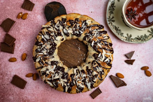 Охлажденный кекс украсьте растопленным шоколадом и присыпьте мелко порубленными миндальными орехами.