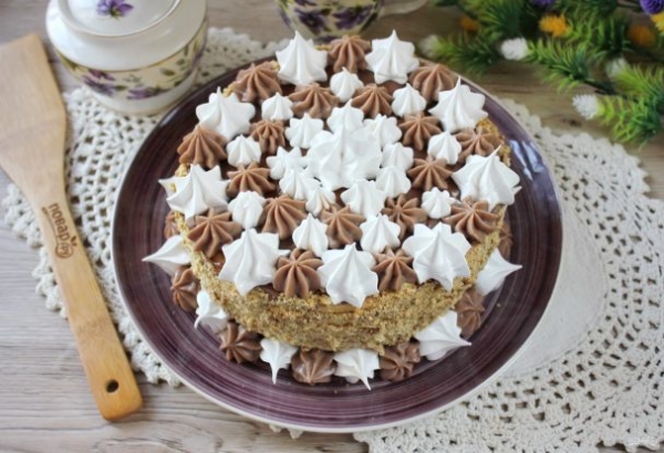 Украсьте торт по вкусу. Я бока торта посыпала измельченным печеньем. Верх и низ оформила розочками из шоколадного и белкового крема.