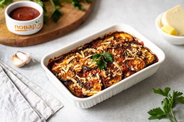 Чередуйте слои, пока не закончатся ингредиенты. Последний слой сделайте томатным. Посыпьте его сыром и уберите в духовку на 30-35 минут.