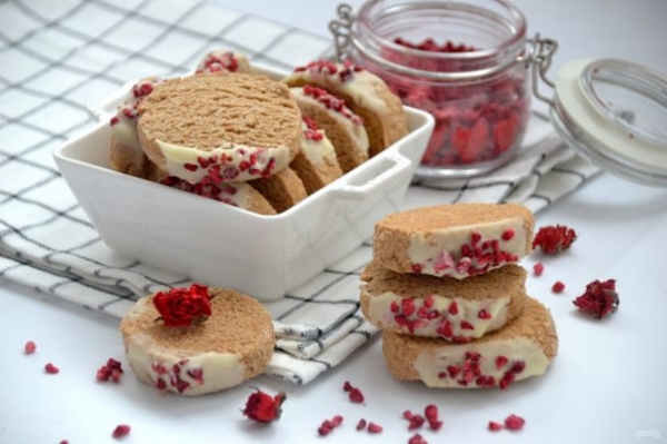 Обмакните в растопленный шоколад кромку печенья и посыпьте сверху сублимированной малиной.