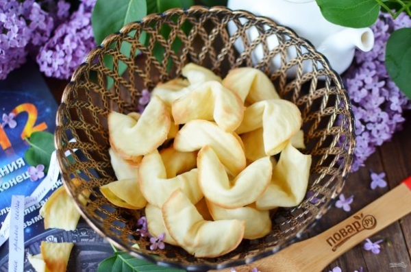 Для печенья понадобится небольшой набор ингредиентов: два крупных яичных белка (примерно 60 грамм), растительное масло, сахарная пудра, соль, мука, крахмал и ванилин. Вместо ванилина можно положить любую цитрусовую цедру. Также понадобится силиконовый коврик или пергамент пропитанный силиконом. Прогрейте хорошо духовку, печенье печется мгновенно, на каждую партию уходит примерно по 5-6 минут, ориентируйтесь по своей духовке, как только края зарумянились — готовы. Не стоит пересушивать печенье, иначе его сложно будет сложить. Складывайте быстро, снимая с пергамента и сразу кладите в стаканы, печенье мгновенно остывает, через пару минут можно доставать. Заранее напишите пожелания, нарежьте полосочками.
