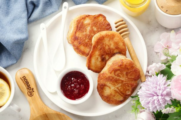 Постные оладьи готовы. Подавайте с мёдом или вареньем. Приятного аппетита!
