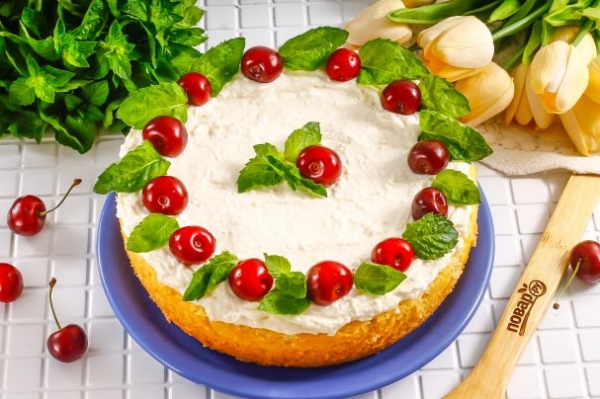 Украсьте ПП торт по своему вкусу: ягодами, фруктами, листочками свежей мяты и т.д. Подайте к столу охлажденным.