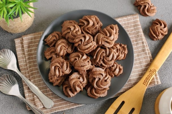 Противень застелите пергаментом. Поместите тесто в кулинарный мешок, и отсадите печенье. Я сделала небольшие зигзаги. Выпекайте в духовке при температуре 180 градусов около 10-12 минут. Здесь главное не пересушить их. Сначала печенье будет мягкое, а после остывания будет больше похоже на песочное.