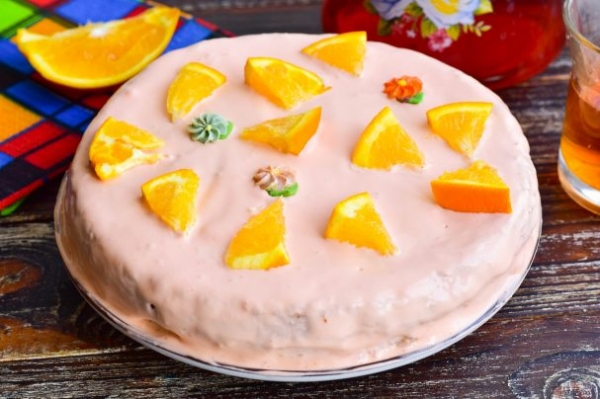 Украсьте торт кусочками апельсина и сахарными фигурками. Отправьте его в холодильник на сутки. Затем подайте к столу, нарезав на кусочки.
