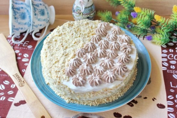 Верх и бока торта тоже смажьте сметаной. Посыпьте печеньем, измельченными орехами или тертым шоколадом. Я украсила торт розочками из взбитых сливок.
