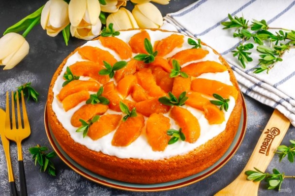Сметанный торт легко приготовить и в домашних условиях. Используйте для пропитки и для украшения десерта любое варенье, которое вы заготовили заранее в летнее время, к примеру — персиковое.