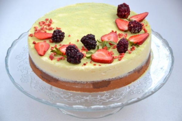 Украсить торт можно на свой вкус. Посыпать какао через ситечко с использованием трафаретов, выложить кусочки фруктов или ягод, украсить орешками и т.п. В данном рецепте верх торта посыпан растворимым чаем матча с молоком, украшен свежей клубникой, сублимированной ежевикой, посыпан кусочками сублимированной клубники. Торт получился нарядным, красивым и очень вкусным!