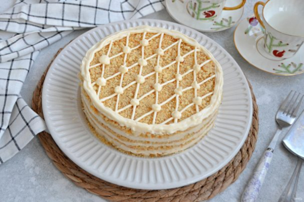 Точно так же выложите все 4 слоя, верхний слой из песочной крошки. Оставьте примерно 2 ст.ложки крема для финального декора. Поставьте торт в холодильник не менее, чем на 4-5 часов для стабилизации, для того, чтобы крем пропитал песочную крошку.