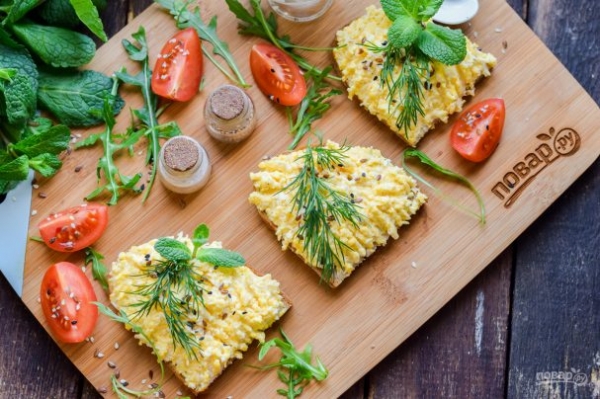 Выложите смесь яиц и сыра на кусочки хлеба, украсьте семенами кунжута. По желанию добавьте по веточке укропа. Подавайте бутерброды к столу.