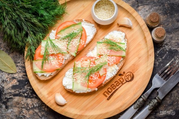 За основу возьмем любимый бездрожжевой хлеб, смажем его творожным сыром, поверх добавим сочные помидоры, огурчик и семена кунжута. Это очень простые, но невероятно вкусные бутерброды, которые идеально подойдут к кофе и чаю.