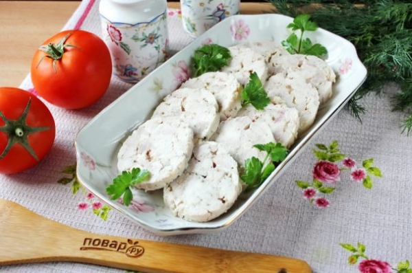 В кастрюлю налейте воду и выложите куриный фарш в форме батона. Доведите воду до кипения и варите ветчину 40-45 минут на небольшом огне.