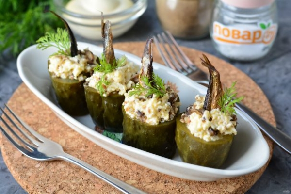 Нафаршируйте огурцы сырно-шпротной начинкой.