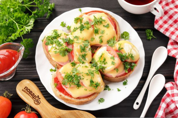 Если в вашем холодильнике нет помидоров, можете обойтись без них или добавить что-то своё. Три ингредиента неизменные: хлеб, сыр и соус. Вместо колбасных изделий можно добавить мясные или овощные котлеты, взять огурцы, лист салата или что-то ещё — универсальная закуска для детей и взрослых.