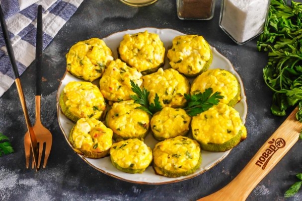Извлеките противень и выложите сырный фарш на шайбочки кабачка. Поместите обратно и запеките еще 10-12 минут.