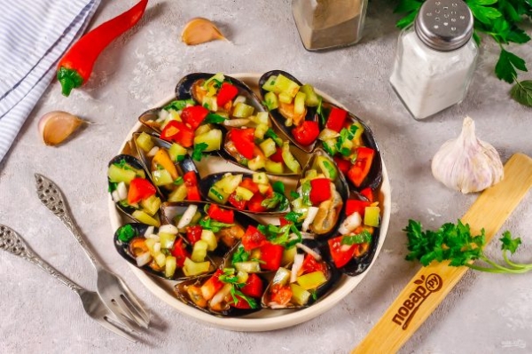 На мидии выложите овощную сальсу и подайте блюдо к столу с бокалом белого вина.