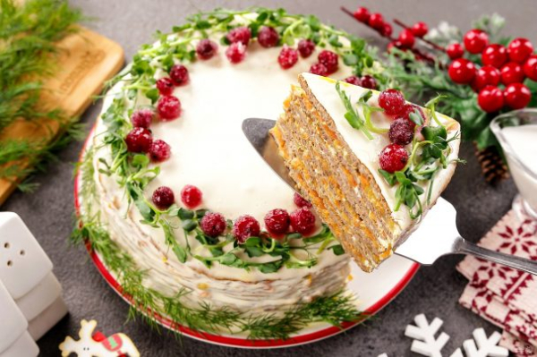 Печёночный торт можно украсить для любого повода. Хочу предложить вам новогодний вариант этой аппетитной закуски. В преддверии зимних праздников решила поэкспериментировать с украшением этого замечательного блюда. Получилось очень вкусно и на столе смотрится красиво. Если захотите разнообразить вкусовую палитру, то закусочный торт можно прослоить и другими начинками: жареные грибы с луком, помидоры с майонезом и чесноком, солёные или свежие огурцы, сладкий перец и баклажаны, варёные яйца с майонезом, тушёная капуста и т.д. Начинку можете использовать любую или чередовать её в слоях закусочного торта. Приготовление несложное, обязательно попробуйте!