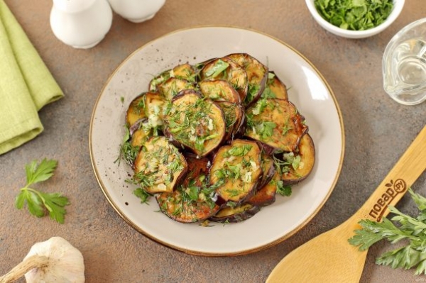 Постная закуска из баклажанов готова. Аккуратно перемешайте ее и подавайте к столу. Приятного аппетита!