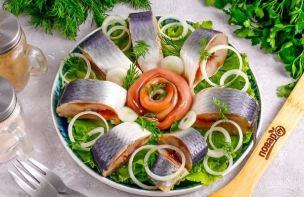 Засолка сельди — пятиминутное дело, которое требует минимум двухдневной выдержки рыбы в рассоле. За 2 дня рыбка получится малосольной, за 3 дня более просоленной и сочной. Добавляйте специи по вкусу.